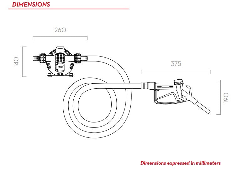 Manuell påfyllningspistol, samt bottenventil som säkerställer ett enkelriktat flöde, och kopplingsdosa med brytare och säkring för överbelastningsskydd. Satsen kompletteras med 2 m kablar med batterianslutningstänger, 6 m slang med 3/4" diameter och sugsats med 1,5 m EPDM-slang.