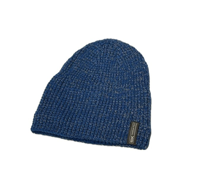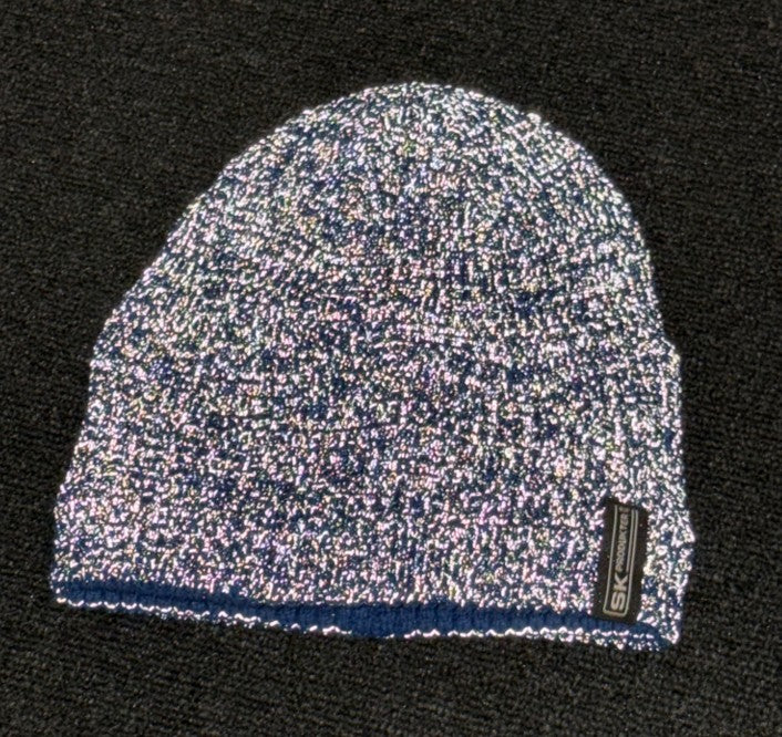 Blå mössa med reflextråd, med diskret SK Produkter-logotyp.