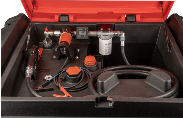Klar att använda med 6 meter påfyllningsslang, dieselfilter, räknare, automatpistol, låsbart lock, tankmätare, lyftöglor och den kan lyftas med pallgafflar.