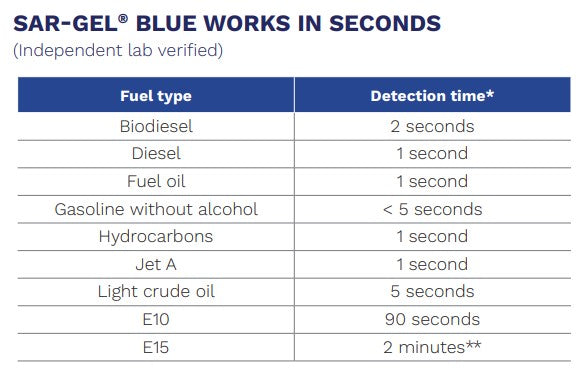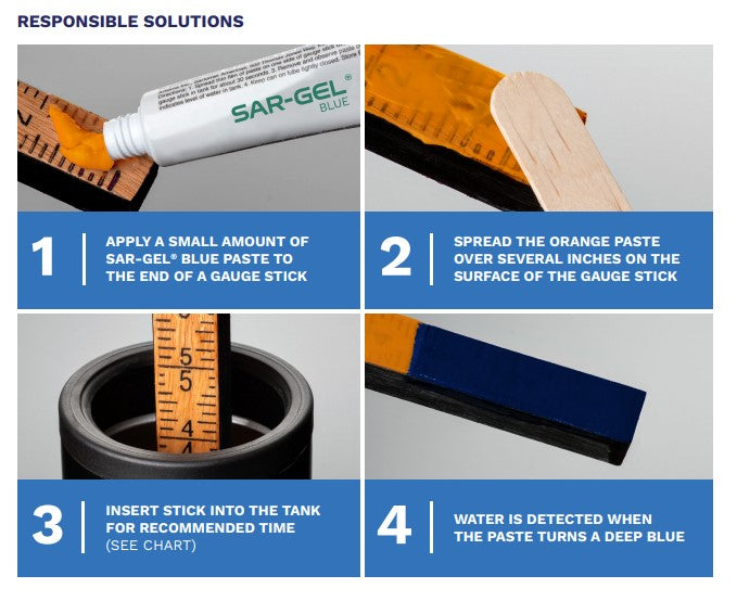 SAR-GEL®-pasta är ett snabbt och tillförlitligt sätt att upptäcka vatten på botten av tankar fyllda med bensin/etanolblandningar upp till 20 % etanol, diesel, jetbränsle, eldningsolja, biodiesel, lösningsmedel och andra vattenkompatibla material.