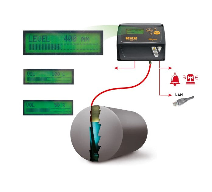 OCIO är en nivåindikator för bränsle- och oljetankar som känner av det statiska trycket som genereras av vätskehöjden med hjälp av ett rör som sätts in i tanken och visar vätskenivån eller volymen.