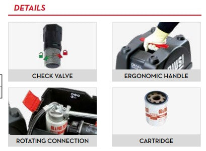 Leveransslangen och handmunstycket gör PIUSIBOX till ett komplett system. Sugslangen med bottenventil gör det enkelt att fylla tanken med bränsle för en snabb och säker bränsleöverföring.